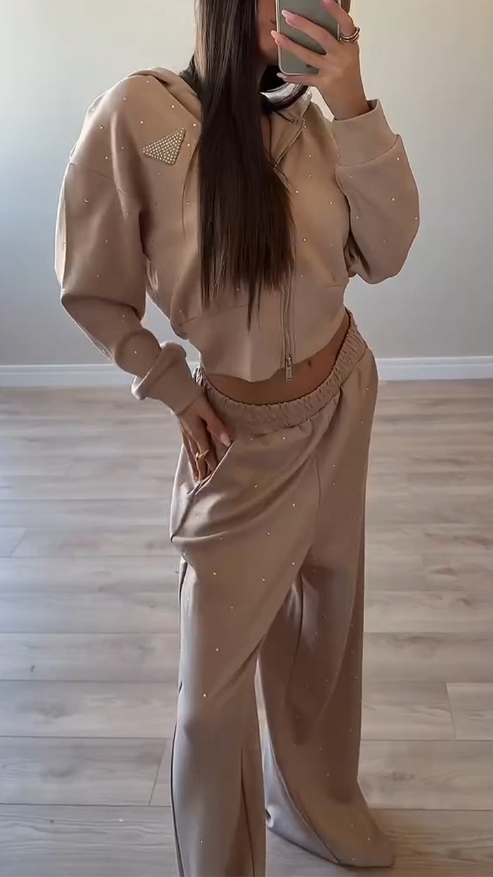 Ladies Round Neck Hooded Rhinestone Jacket+ Pants Casual Set