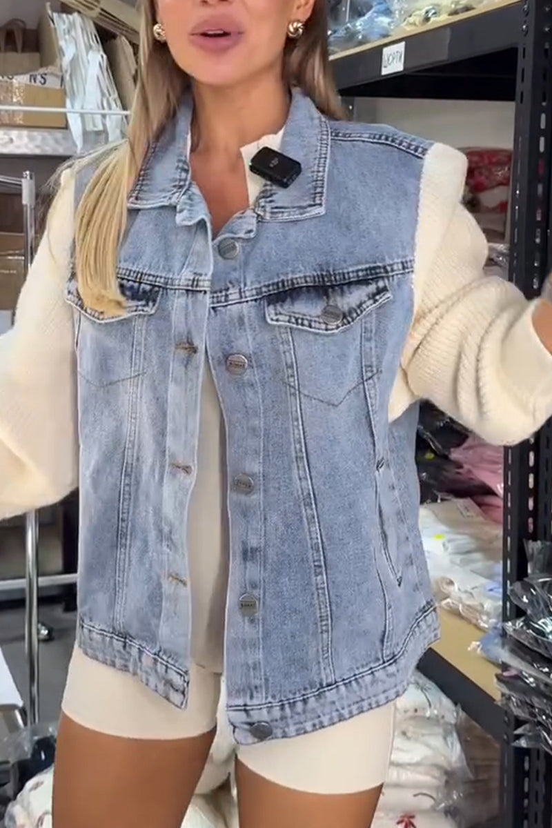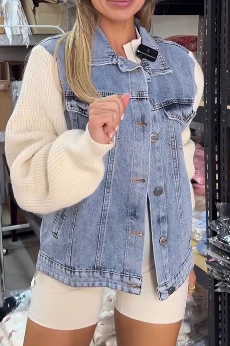 Women Lapel Denim Stitching Knit Sleeves Casual Jacket