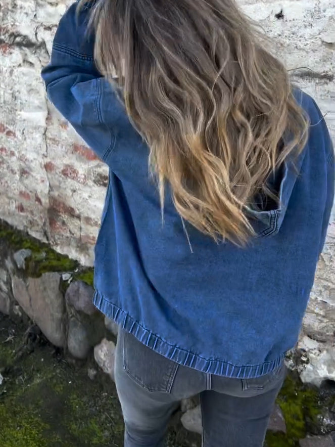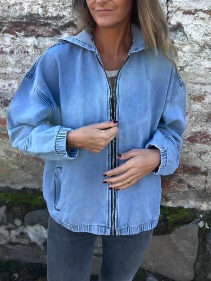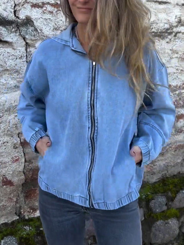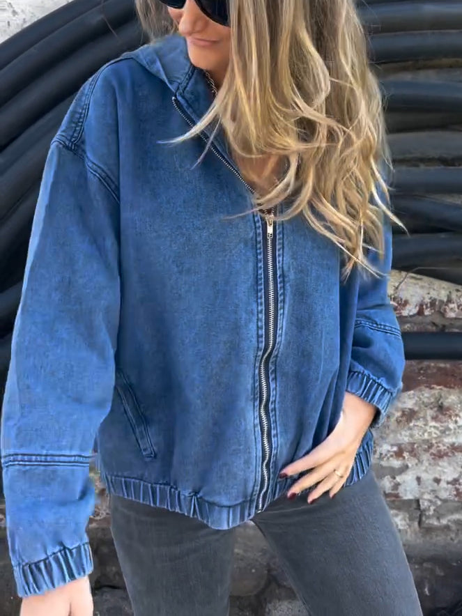 Women Round Neck Hooded Zipper Casual Denim Jacket