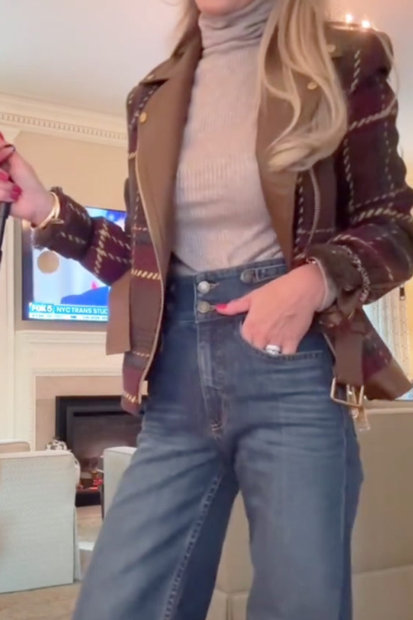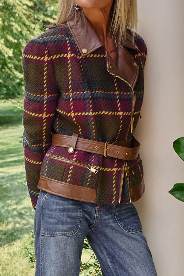Women Vintage Plaid Lace-Up Leather Panel Jacket