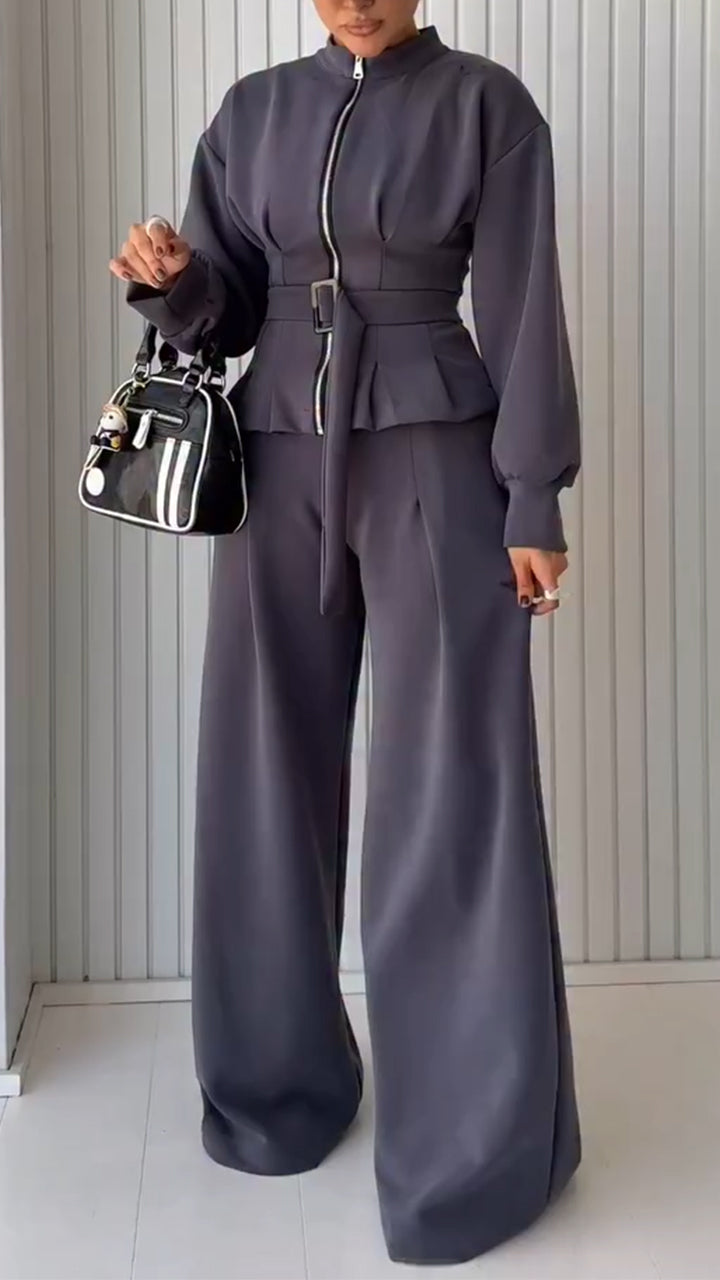 Womens Round Neck Zipper Jacket + Pants Casual Suit