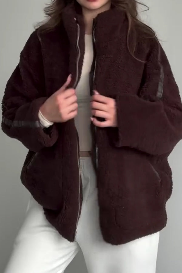 Women Casual Stand Collar Zipper Large Pocket Plush Jacket