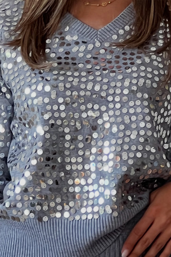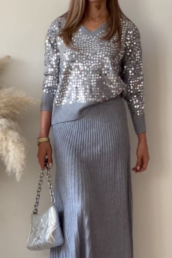 Women Casual V-Neck Sequin Pullover Sweater + Knitted Skirt Set