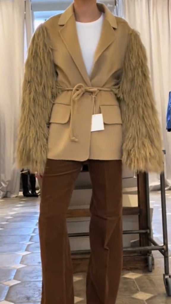 Women Lapel Spliced sleeves Wool Stripe Temperament Casual Jacket