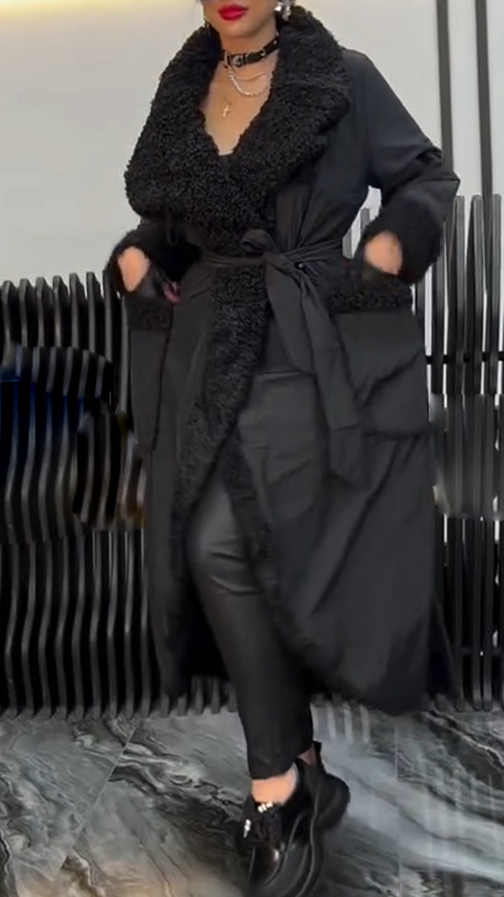 Women Lapel Stitching Plush Casual Long Cotton Coat
