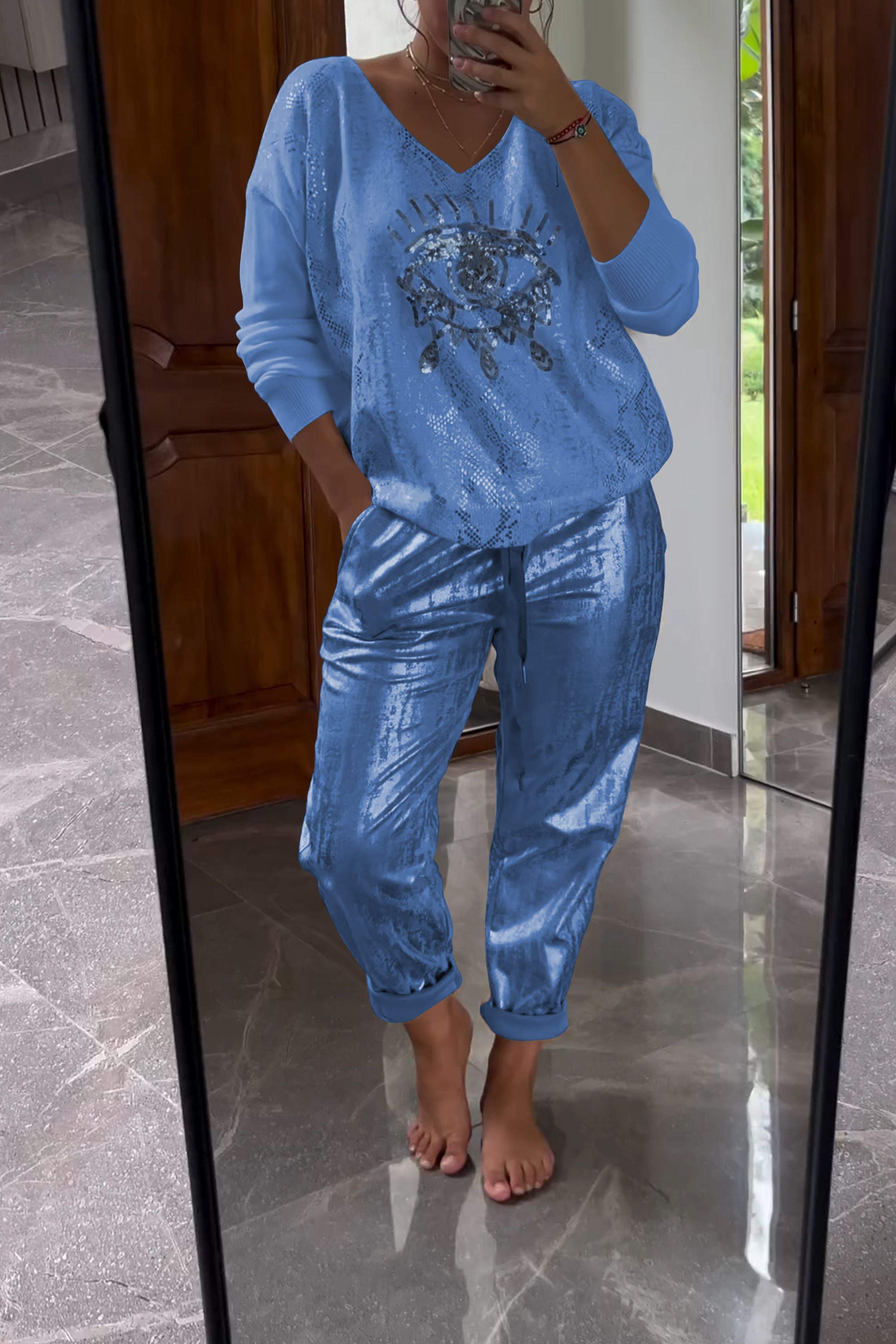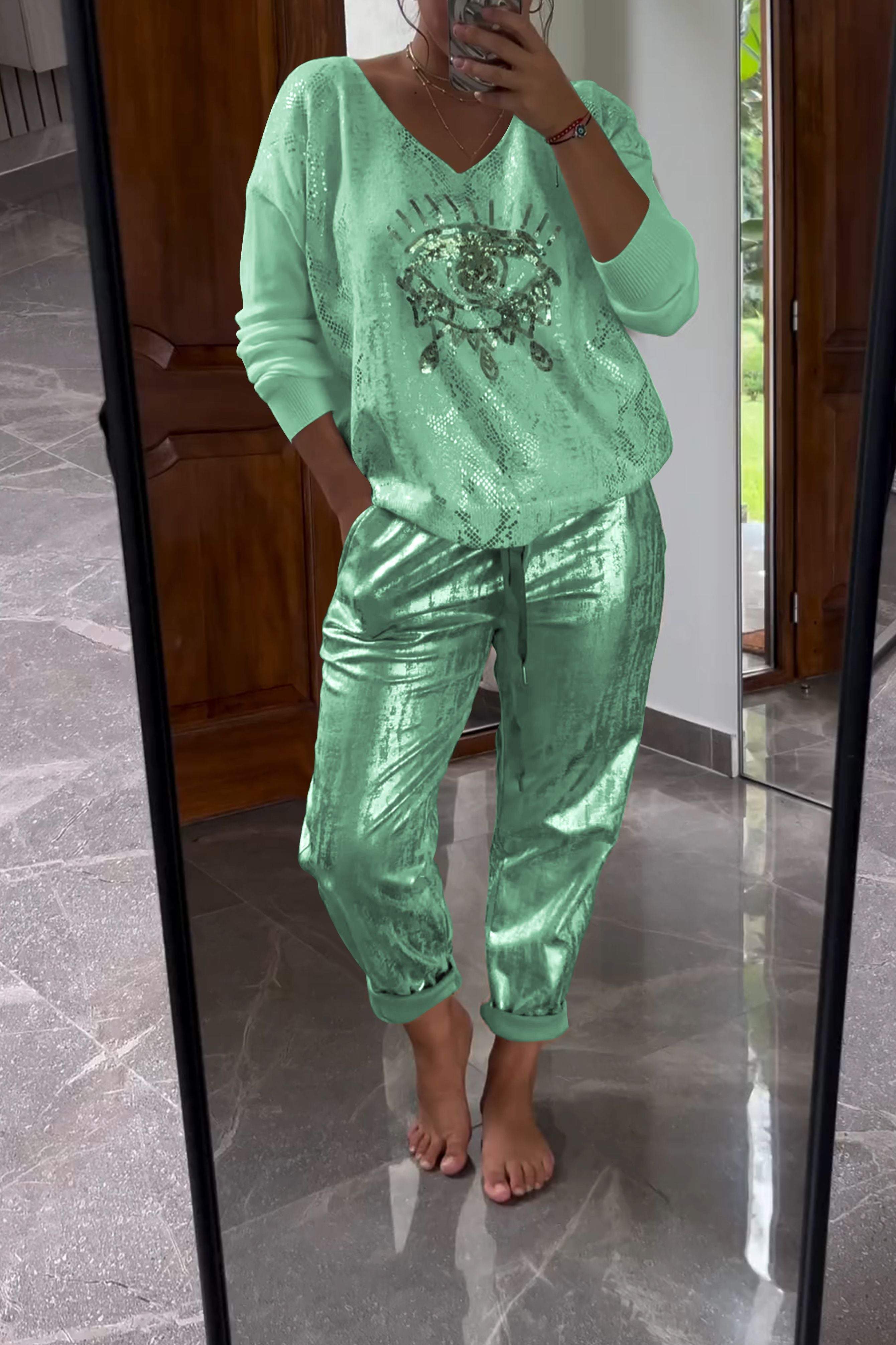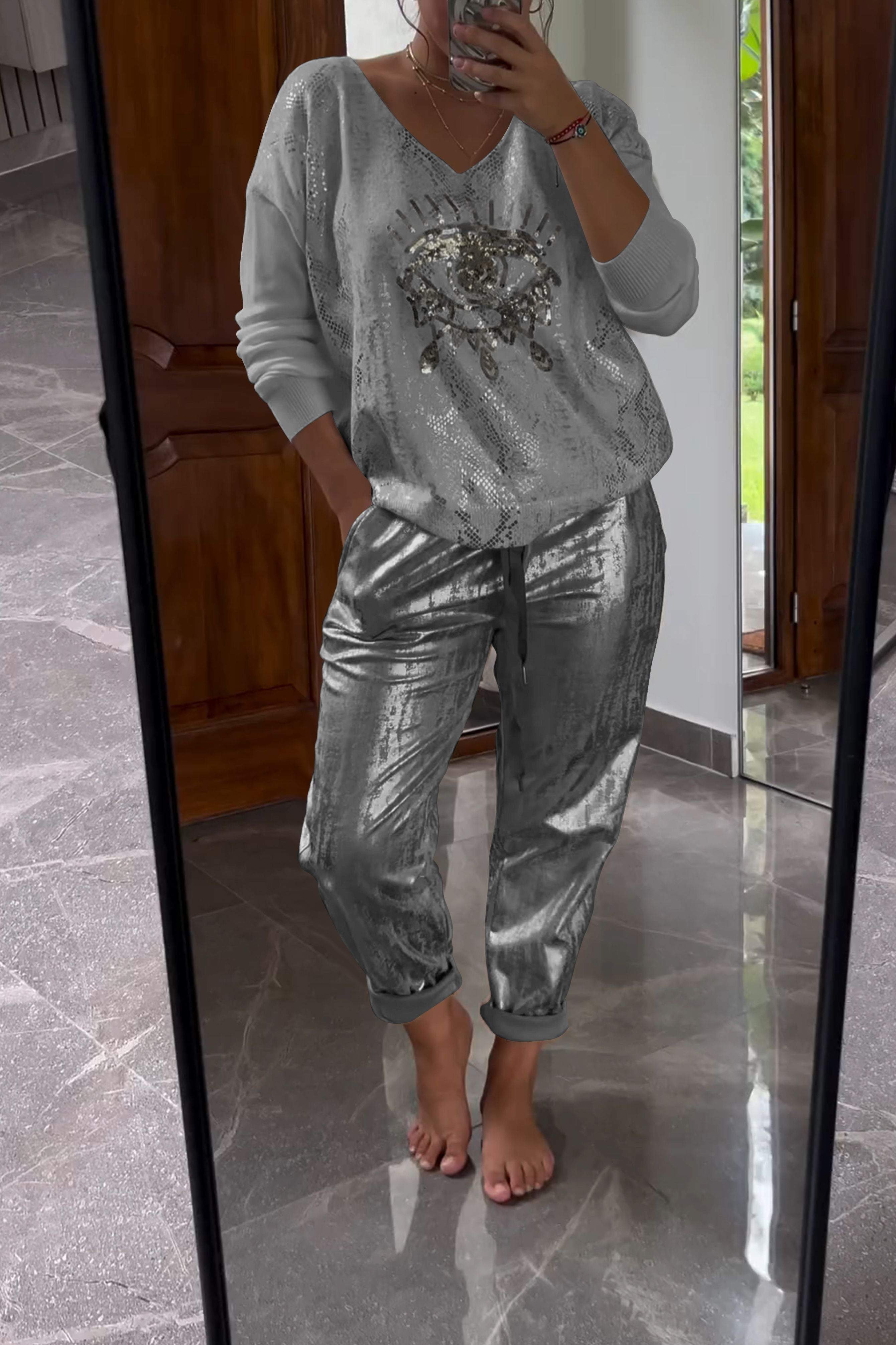 Fashionable Sequin Top And Bronzing Trousers Two-piece Set