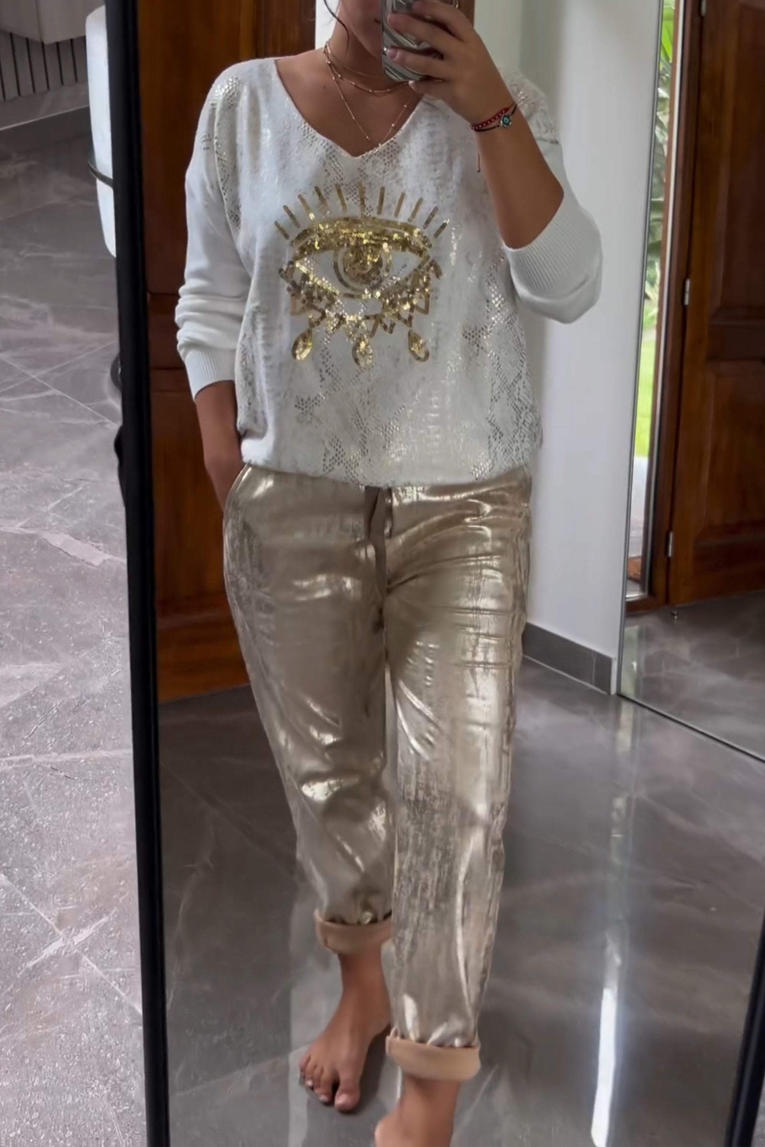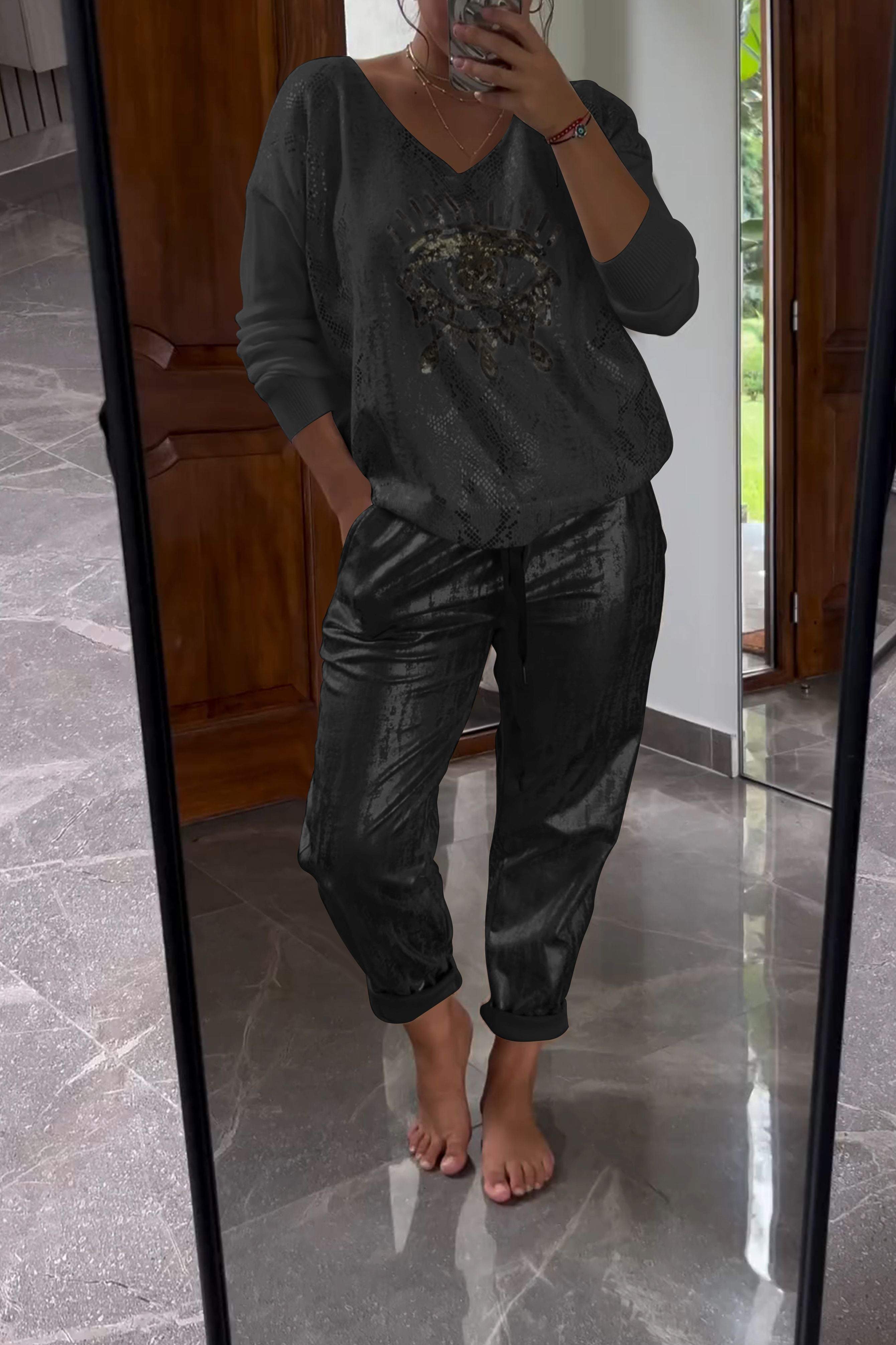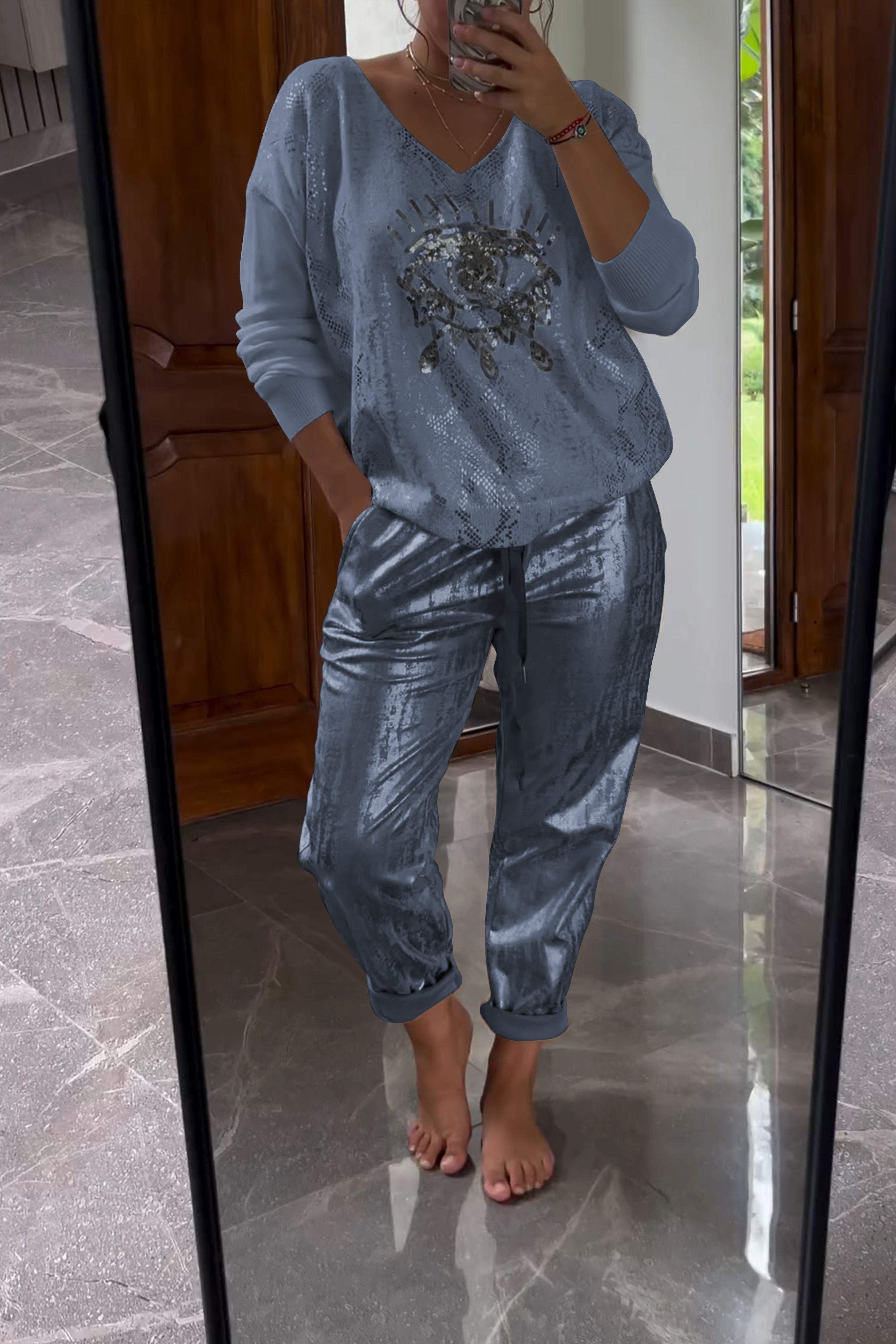 Fashionable Sequin Top And Bronzing Trousers Two-piece Set