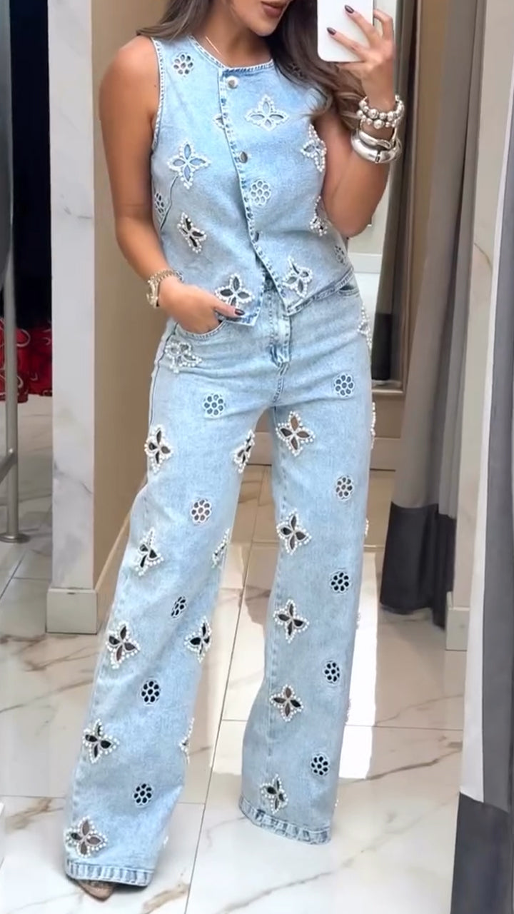 Ladies Round Neck Printed Hollow Nail Bead Denim Casual Set