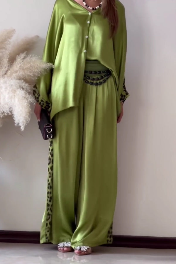 Women Casual Satin Leopard Print Shirt + Wide-Leg Pants Suit