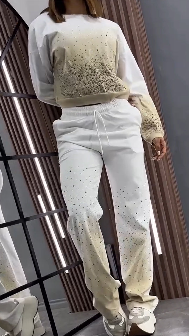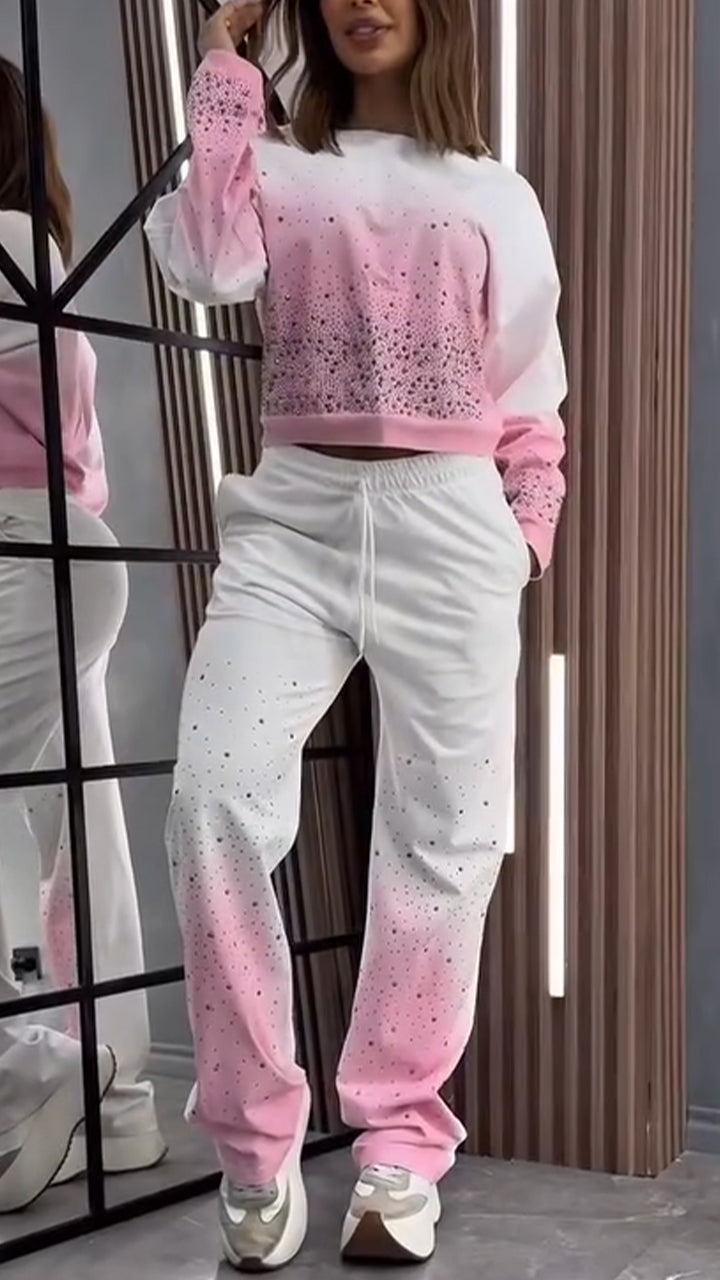 Women Round Neck Gradient Hot Diamond Casual Suit