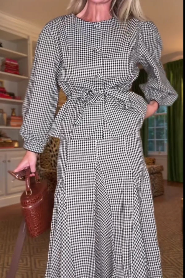 Women Round Neck Tie Plaid Top + Irregular Fishtail Skirt Set