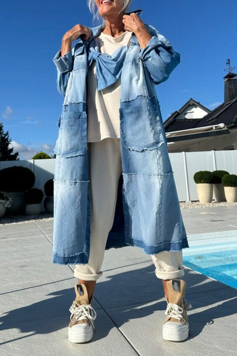Women Lapel Splicing Washed Casual Long Cardigan
