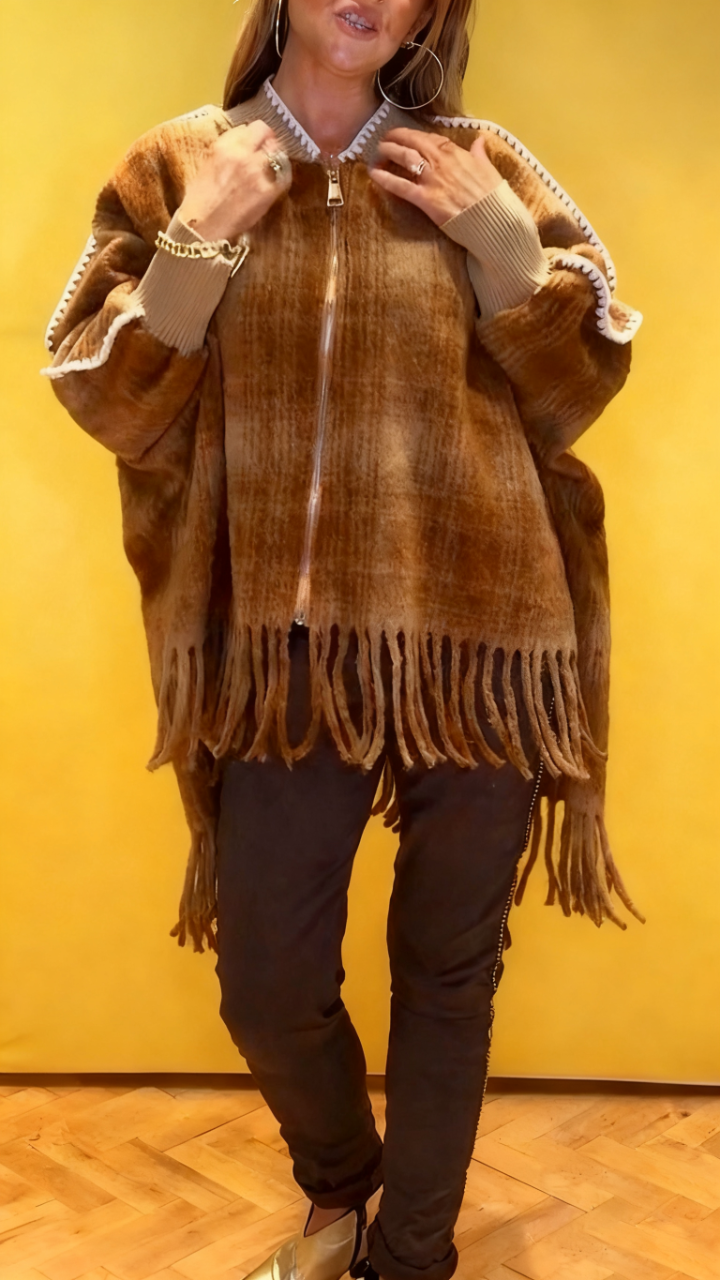 Women Round Neck Plaid Patchwork Tassel Casual Jacket