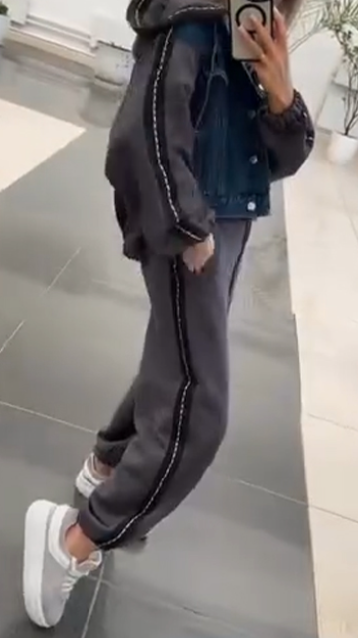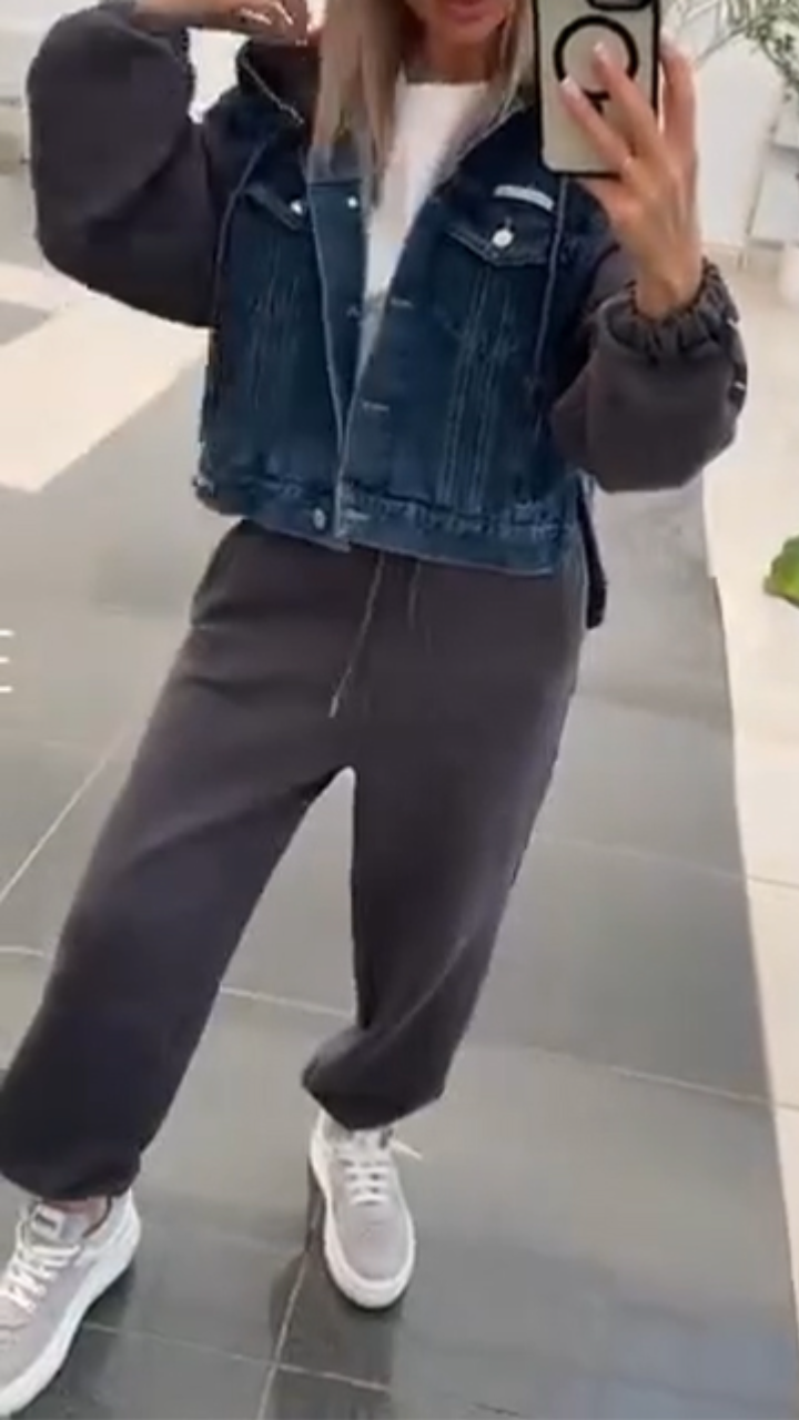 Women Denim Patchwork Hooded Jacket + Pants Casual Suit