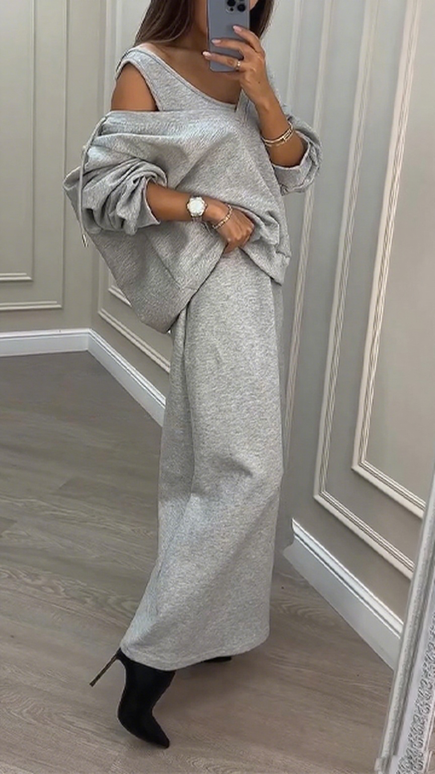 Women V-neck Sweatshirt + Dress Solid Color Casual Suit