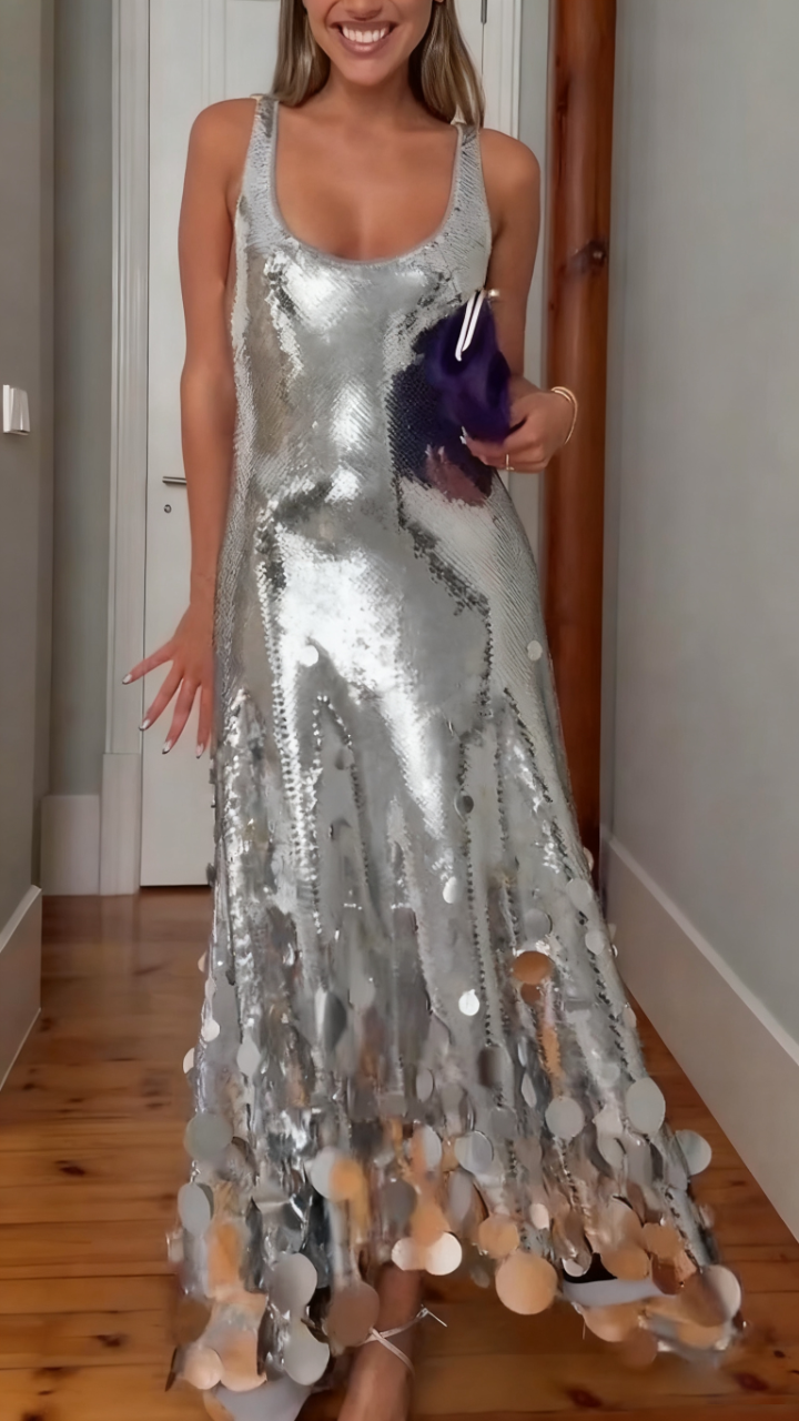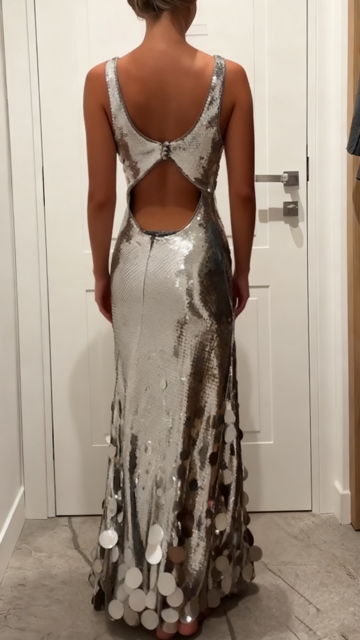 Women Suspender Silver Sequined Tassel Back Hollow Elegant Dress